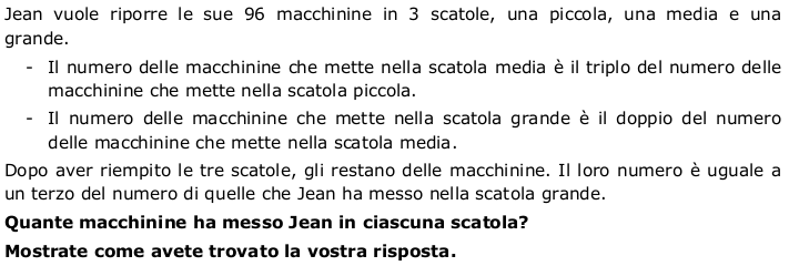 - Procedendo in modo più sintetico (o pre-algebrico) si può lasciare provvisoriamente indeterminato uno dei numeri (per esempio il più piccolo) e calcolare che la somma di $1$ “piccolo”, $3$ “piccoli”, $6$ “piccoli”, $2$ “piccoli” rappresentano $12$ “piccoli” corrispondenti a $96$. Non resta, allora, che dividere $96$ per $12$ ($96 \div 12 = 8$) per determinare il numero di macchinine della scatola piccola e poi trovare i numeri delle macchinine delle altre scatole.