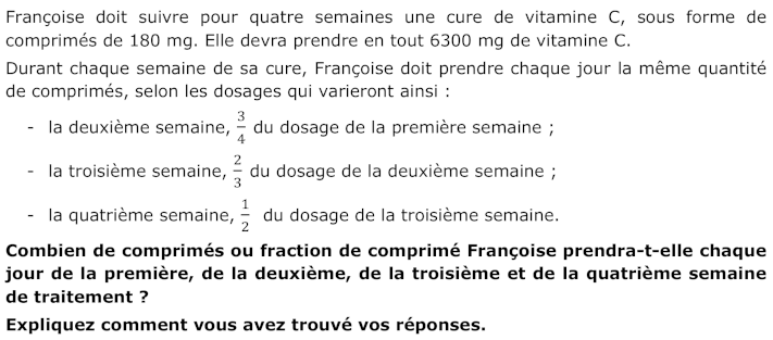 - Comprendre que la cure a une durée quatre semaines, et que la posologie change chaque semaine; que la masse totale de vitamines à prendre est connue: à savoir $6300$ mg ou $35$ pastilles de $180$ mg, répartie selon les rapports entre les quantités à prendre par semaine.