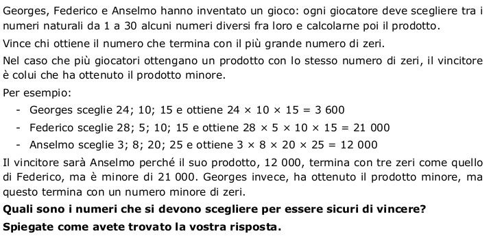- Ricordarsi che cos’è il prodotto di più numeri (analizzando gli esempi dell’enunciato) e rendersi conto che c’è un grande numero di prodotti composti da fattori scelti tra i numeri da $1$ a $30$; prodotti di due fattori, di tre fattori, ... fino ad arrivare a $30$ fattori. Tra tutti questi prodotti sarà necessario soffermarsi solo su quelli che terminano per zero.