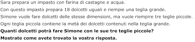 - Per appropriarsi del problema, è necessario mettere in relazione i dati: il numero dei dolcetti e il rapporto fra le dimensioni delle teglie ci sono 18 dolcetti nella teglia grande, la metà dei dolcetti della grande nella teglia piccola, tenendo presente al contempo che tutti i dolcetti hanno la stessa dimensione.