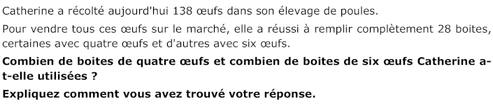Pour s’approprier la situation, il faut comprendre que des boîtes de quatre et six œufs doivent être utilisés et que le nombre total de contenants (28) et le nombre total d'œufs (138) ont connus.