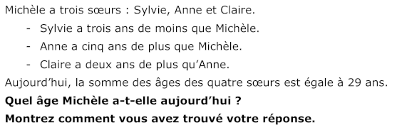 - À partir de la somme 29 à partager en 4, donner 7 ans à Michèle, vérifier que ça ne va pas et continuer avec les ajustements appropriés pour finalement obtenir la solution.