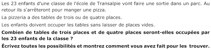 - Dessiner un certain nombre de tables de 3 places et de 4 places et essayer de répartir les 23 élèves sans laisser de places vides.