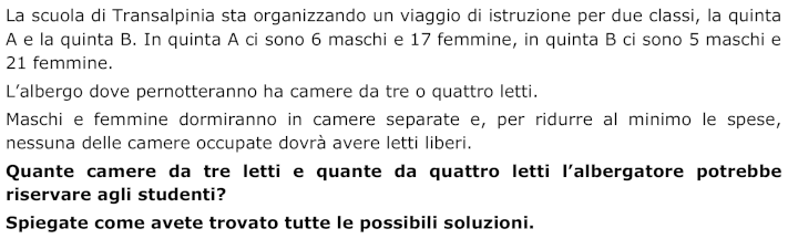 Facendo un ragionamento analogo per le 17 femmine della quinta A e le 21 della quinta B si possono ottenere queste possibilità: 2 camere da tre letti e 8 da quattro letti; 6 camere da tre letti e 5 da quattro letti; 10 camere da tre letti e 2 da quattro letti.