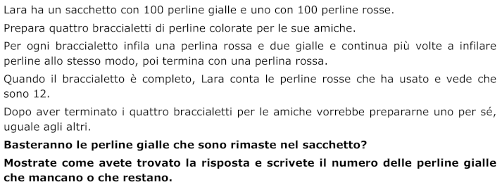 - Considerare che per cinque braccialetti occorrerebbero 110 (= 22 × 5) perline gialle e dedurre quindi che ne mancano 10 per l’ultimo braccialetto.