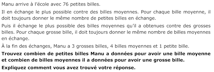 - Déduire que comme il reste 1 petite bille à la fin, 75 billes seront échangées contre 3 grosses billes et 4 billes moyennes.
