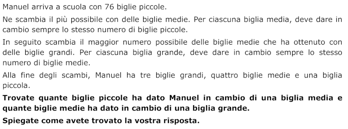 - Dedurre che, poiché alla fine resta una biglia piccola, saranno scambiate 75 biglie piccole per 3 biglie grandi e 4 biglie medie.