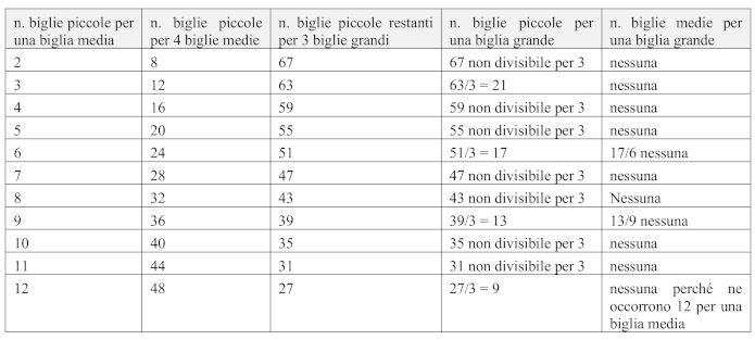 - Procedere per tentativi organizzati come, ad esempio, nella tabella seguente che riporta tutti i casi possibili corrispondenti a 3 biglie grandi + 4 biglie medie = 75