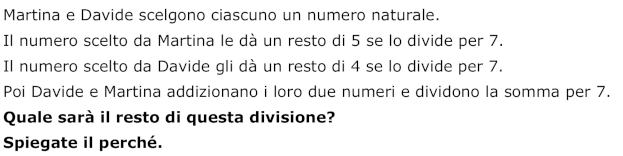 Scoprire una proprietà dell’addizione di numeri naturali, quando si osservano i resti delle divisioni per 7: la somma di un numero il cui resto della divisione per 7 è 5 e di un numero i cui resto della divisione per 7 è 4 è un numero il cui resto della divisione per 7 è 2. Bisogna prima verificare questa proprietà su alcuni esempi, poi constatare che sembra generalizzabile per tutte le coppie scelte, poi cercare di spiegare il perché.
