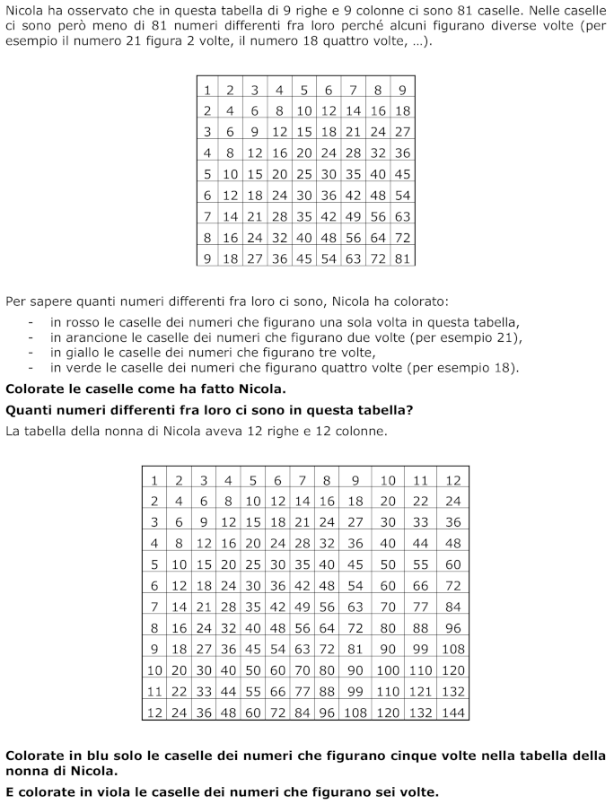 Le 5 caselle rosse (5 numeri differenti, le 22 caselle arancioni in una sola delle parti simmetriche (22 numeri d differenti), 4 caselle gialle sulla diagonale, ciascuna ripetuta una volta sulle due parti simmetriche (4 numeri differenti) e 10 caselle verdi su una sola delle parti simmetriche con due numeri uguali 6, 8, 12, 18 e 24 (5 numeri differenti in totale) Questo compito richiede attenzione: precisione, controllo, tutte qualità caratteristiche di un approccio matematico.