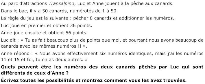 - A partir de la différence 30 (= 56 – 26) entre le total des points et la somme des nombres 11 et 15 des canards pêchés par Anna. Cette différence est justement égale à la somme des six nombres pêchés aussi bien par Anne que par Luc et donc 6 (= 36 – 30) est la somme des nombres des canards pêchés par Luc et non par Anne. Considérer alors les couples de nombres entiers différents et plus grands que zéro dont la somme est 6, (0 ; 6) et (3 ; 3) non acceptables et déduire que les uniques couples possibles sont (1 ; 5) (2 ; 4). Finalement déduire que les différents canards pêchés par Luc sont le numéro 1 et le numéro 5 ou bien le numéro 2 et le numéro 4.
