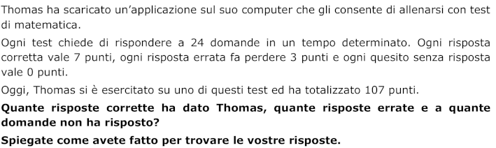 - La lettura dell’enunciato conduce alla relazione numerica «7 volte il numero di risposte corrette meno 3 volte il numero di risposte errate è uguale a 107». Il calcolo del terzo numero sarà la differenza tra le 24 domande e la somma delle risposte corrette e delle risposte sbagliate.