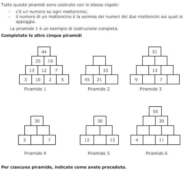 Completare "piramidi" di mattoncini secondo la regola: "il numero di un mattoncino è la somma dei numeri dei due mattoncini su quali si appoggia".