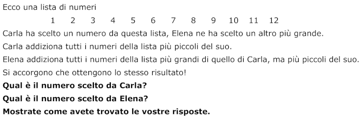 Trovare due numeri naturali tra i primi 12 tali che la somma dei numeri inferiori al più piccolo sia uguale alla somma dei numeri compresi tra i due.