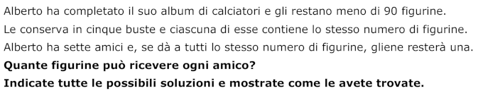- L'insieme dei multipli di 5 deriva dalla "traduzione" di "cinque buste e ciascuna di esse contiene lo stesso numero di figurine": 85; 80; 75; ... 5; 0