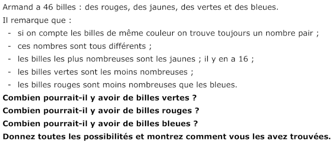 - la décontextualisation: traduction de l'énoncé en termes mathématiques (addition de nombres). Y a-t-il des copies où cette décontextualisation n'est pas faite: incompréhension des deux données "si on compte les billes de même couleur on trouve toujours un nombre pair" et "ces nombres sont tous différents" ; ou incompréhension de la question sous sa forme interrogative "Combien pourrait-il y avoir ..."