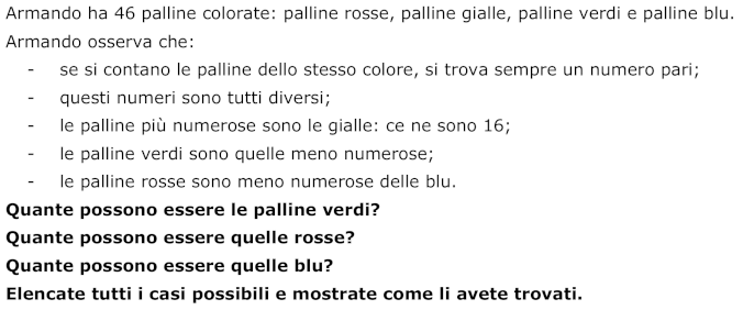 - la decontestualizzazione: traduzione dell'enunciato in termini matematici (addizione di numeri). Esistono copie in cui questa decontestualizzazione non viene effettuata: incomprensione dei due dati "se contiamo le palline dello stesso colore troviamo sempre un numero pari" e "questi numeri sono tutti diversi"; oppure incomprensione della domanda nella sua forma interrogativa "Quanti potrebbero essere..."