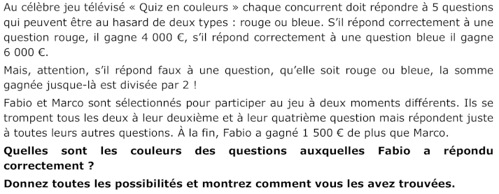 Déduire les suites possibles de réponses correctes de Fabio : BBR (8500), RRB (9000), BRB (9500), RBB (10000), BBB (10500).
