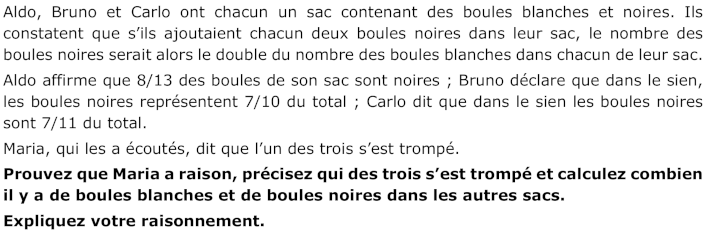 Ou, procéder par essais successifs, à partir des rapports donnés : 8/13 pourrait correspondre à 8 noires et 5 blanches (13-8), ce qui convient puisque 8 est le double de 5 diminué de 2. 7/10 pourrait correspondre à 7 noires et 3 blanches ou bien 14 noires et 6 blanches mais remarquer que les boules noires seront toujours plus du double des blanches, et donc que cela ne pourra pas convenir. 7/11 convient avec 14 boules noires et 8 blanches (14 = 2 x 8 – 2).