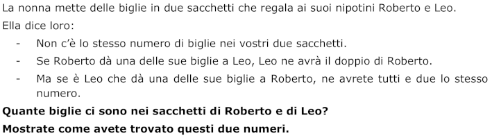 - Trovare così che se Leo ha 7 biglie e Roberto 5, quando Roberto dà una biglia a Leo, questi ne avrà 8 cioè il doppio di quelle che sono rimaste a Roberto (4).