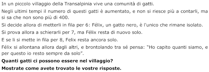 - Una altra procedura può essere quella di scomporre i tre numeri in fattori primi (6 = 2 × 3; 7 = 7 × 1; 8 = 23) e calcolare il prodotto dei fattori che compaiono in ciascuno dei tre numeri 168 (2 × 2 × 2 × 3 × 7 = 168) quindi aggiungere 1 per arrivare al numero dei gatti, Felix incluso, ovvero 168 + 1 = 169. Si può anche calcolare il prodotto dei tre numeri, 6, 7 e 8 e poi aggiungere 1. Si ottiene così 337. Si verifica poi che gli altri multipli comuni a 6, 7 e 8, aumentati di 1, superano 400.