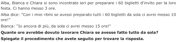 Questo non è rilevante per questi livelli, a meno che non si ometta il numero di biglietti preparati in 3 ore (informazione non necessaria). la prima frase dell'enunciato dovrebbe essere la seguente: Alba, Bianca e Chiara si sono incontrate ieri per preparare i biglietti d’invito per la loro festa. Ci hanno messo 3 ore.