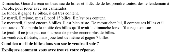 Les premières analyses de copies ont montré que de nombreux groupes ont compris que les billes qu’il a perdues depuis le dimanche sont la somme des deux pertes effectives du mardi et mercredi, soit 15 + 8 = 23 et que, par conséquent, le nombre de billes du vendredi est alors défini à partir des 46 billes (le double de 23) trouvées pour le dimanche, par l’opération 46 + 12 – 15 – 8 + 7 = 42. Le texte d’origine avait été modifié en dernière heure en tenant compte de certaines remarques de la consultation qui trouvaient que “le reste” ajoutait une difficulté à un problème qui leur semblait déjà trop difficile.