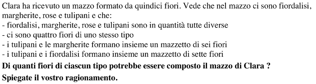 - Trovare l’unica composizione possibile (4 tulipani, 2 margherite, 3 fiordalisi, 6 rose), verificare la sua unicità eliminando via via le altre soluzioni, perché non rispettano le consegne e rispondere alla domanda.