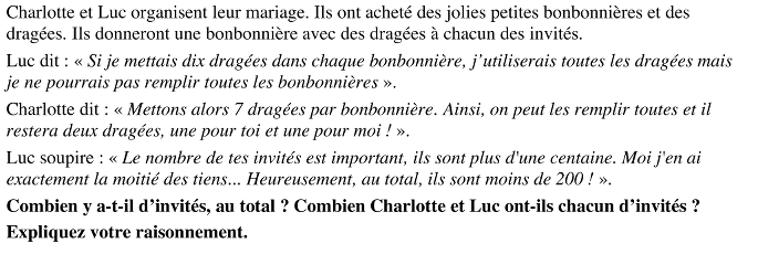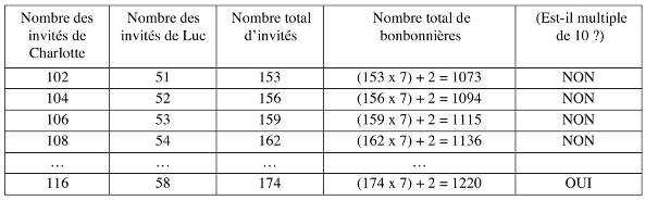 Ou bien, sur la base des déductions précédentes, considérer que le nombre des bonbonnières est le triple de celui des invités de Luc, que le nombre total des dragées est le triple de ce que les invités de Luc recevront et par conséquent que ce nombre est multiple de 3 et de 7 (nombre de dragées par bonbonnière), c'est-à-dire de 21. Chercher parmi les nombres entiers compris entre 50 et 66 un nombre qui, multiplié par 21, donne un résultat qui ait 8 comme chiffre des unités. Constater que l’unique possibilité est 58. Conclure que les invités de Luc sont 58, ceux de Charlotte sont 116, pour un total de 174.