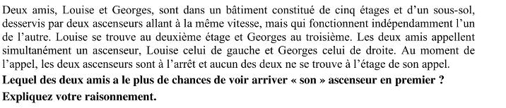 - Se rendre compte que dans certains cas, l'ascenseur de Louise arrivera d'abord, dans d’autres cas celui de Georges sera le premier et dans les autres, les deux ascenseurs arriveront en même temps.