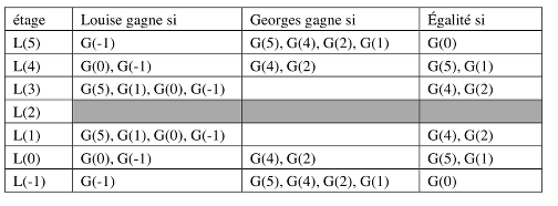 - Décrire la situation finale dans chacune des 36 possibilités en s'aidant, par exemple, d’un tableau comme ci-dessous (on note L(5) ou G(5) pour dire que l'ascenseur de Louise ou, respectivement, celui de Georges est au cinquième étage). Selon la position initiale de l’ascenseur de Louise, on associe celles de celui de Georges qui font gagner Louise, respectivement Georges, respectivement donnent l’égalité.