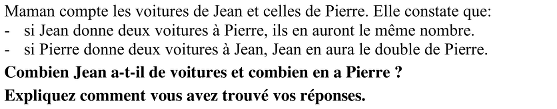 Mais, de toute manière, il n’y a que quelques essais à faire pour arriver à la solution : 14 voitures pour Jean et 10 pour Pierre et s’assurer qu’il n’y en a pas d’autre.
