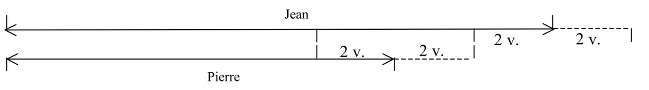 Ou, représenter la situation par un schéma où apparaissent clairement les écarts de 2, en plus et en moins et les 8 voitures qui représentent la moitié de celles de Jean après le deuxième échange où les deux enfants ont 8 et 16 voitures. Par conséquent, Jean a 14 voitures et Pierre en a 10 avant les échanges.