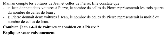 Ou, par voie algébrique, la solution est celle d’une équation ou d’un système d’équations comme (P + 2) /(J – 2) = 3/4 et (P – 2) /(J + 2) = ½ dont la solution est (P ; J) = (16 ; 26)