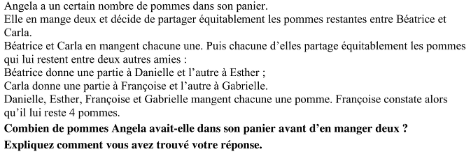 - Par essais :faire le choix d’un nombre initial de pommes dans le panier et dérouler la situation. Angela en mange 2, constater que le nombre restant doit être pair pour que le partage équitable puisse se faire et donc que le nombre initial de pommes doit lui aussi être pair.