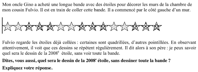 Ou : grouper les étoiles constituant le motif répétitif par 5 et effectuer la division 2008 : 5 = 401 reste 3. En conclure que la 2008ème étoile est quadrillée.