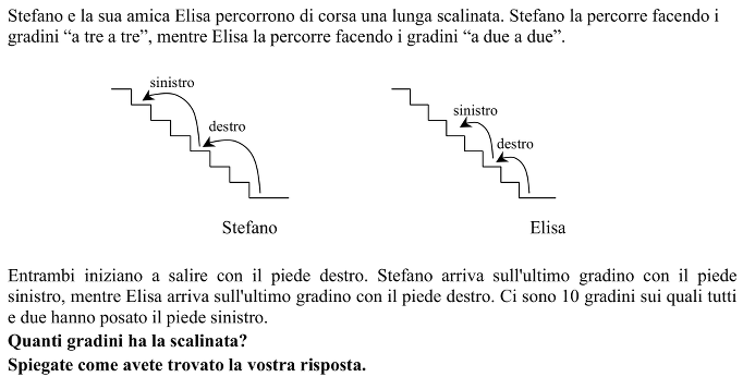 Appropriarsi della situazione evidenziando la successione dei primi gradini sui quali ciascuno dei due bambini posa il piede. Passaggio all’ambito numerico: multipli di 2 e di 3 e dedurre che il numero di gradini della scala deve essere un multiplo comune, cioè un multiplo di 6.