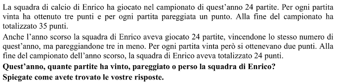 Oppure osservare che ci sono 11 punti di differenza tra i due campionati (35 – 24) dovuti alle tre partite pareggiate in più e al punto in più attribuito a ogni partita vinta quest’anno (cioè, 8 volte un punto). Quindi, togliendo da 35 i punti guadagnati al momento delle 8 vincite, si ottengono 11 partite pareggiate.