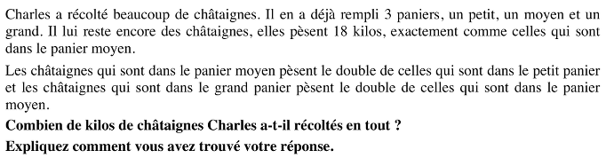 - De la lecture de l’énoncé, comprendre qu’il y a les poids des châtaignes contenues dans les trois paniers à déterminer dont un seul est connu (18 kg pour le panier moyen) et qu’il faudra leur ajouter le poids des châtaignes qui restent, égal au poids des châtaignes du panier moyen.