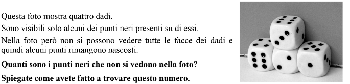 - Osservare i quattro dadi nella foto. Per ciascuno di essi identificare le facce visibili e i loro punti e immaginare le altre facce, non visibili, poi dedurne per esclusione i punti di ciascuna.