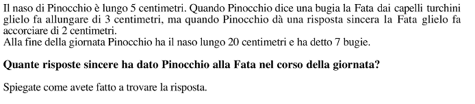 Abbiamo aggiunto ai 5 cm del naso di Pinocchio 7 volte i 3 cm, le sette volte corrispondono alle bugie e i 3 cm all’aumento della lunghezza del naso ad ogni bugia e abbiamo trovato 26 cm e ai 26 cm abbiamo tolto i 2 centimetri delle risposte sincere finché non abbiamo trovato 20. Abbiamo contato quanti 2 c’erano e abbiamo scoperto che c’erano 3 numeri due e quindi ha detto 3 risposte sincere.