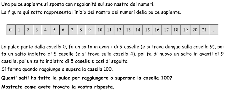 - Capire le regole di spostamento della pulce: un salto di 9 caselle a partire da 0 fa raggiungere alla pulce la casella 9, poi un salto di 5 caselle indietro la fa tornare alla casella 4, poi il salto successivo la fa arrivare sulla casella 13, ...