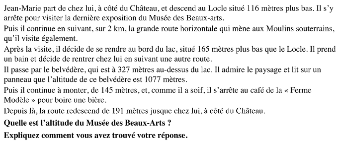 Voir figure 1 : Les montées et descentes sont indiquées par leur sens, en dénivellation. Le départ est à gauche. Les altitudes ne sont que relatives ; le schéma permet cependant, à partir de 1077 de revenir dans le temps par 327 vers le bas (-327) pour arriver au lac et de 165 vers le haut (+165) pour arriver aux Moulins puis au Musée, puis vers le haut (+116) pour revenir au départ, à 1031 (Cette dernière information n’était pas demandée).