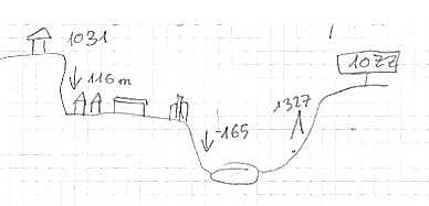 - Une classe a établit un schéma suffisant avec flèches et Belvédère à 1077 m, mais là aussi, les altidudes ne sont pas reliées aux dévivellations. Il n’y a que quelques esquisses d’opérations entre dénivellations.