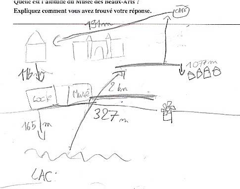 - Une classe a pu établir un schéma correct des six lieux, dont le Belvédère à 1077 m, avec des flèches indiquant les montées et les descentes et la grandeur de la dénivellation. Mais il n’y a pas d’opérations correspondantes, comme si les nombres qui indiquent les altitudes ne sont pas reliés aux nombres indiquant les dénivellations.