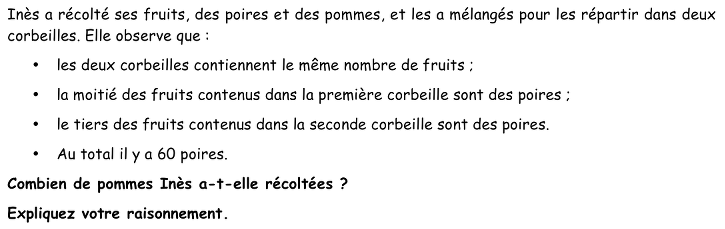 - S’approprier la situation : il y a deux corbeilles contenant un même nombre de fruits (des pommes et des poires), et comprendre que dans la première corbeille, la moitié des fruits sont des poires et que dans la seconde corbeille, le tiers des fruits sont des poires.