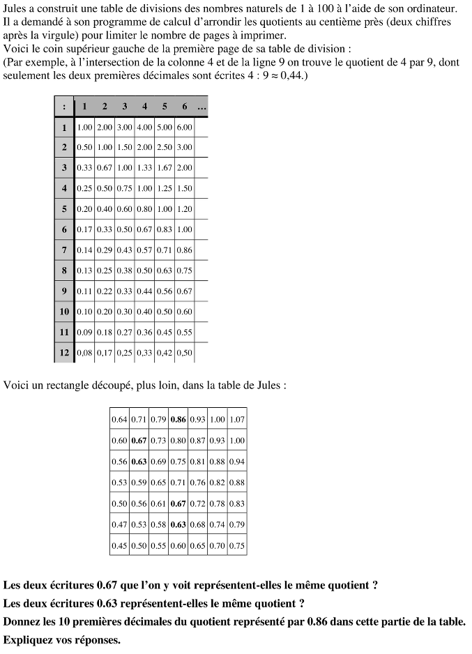 Le contexte d’une table de division n’est certes pas familier et peut expliquer une partie des « 0 point » (dans près de 60% des cas) mais l’examen de près de 200 copies (SR et FC) montre qu’il y a d’autres obstacles au niveau des écritures décimales de nombres rationnels, des approximations, des quotients équivalents, ...