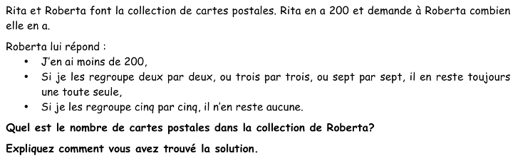 - Trouver que seul 84 répond à ces exigences et conclure que Roberta possède donc 85 cartes postales.
