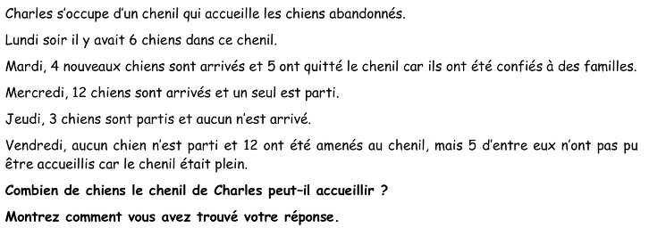 - Comprendre la succession des arrivées et départs du chenil (qui ne sont pas toujours données dans le même ordre). Comprendre que le vendredi il faut compter une arrivée de 7 chiens seulement (12 – 5). Comprendre enfin que le nombre de chiens obtenu à la fin correspond à la capacité d’accueil du chenil.