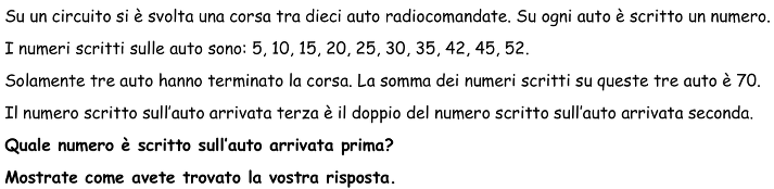 - fare la somma di tre dei numeri tra quelli assegnati, confrontare la somma con 70 e se è uguale a 70, guardare se tra i tre numeri uno è il doppio di uno degli altri due. Per essere sicuri dell’unicità della soluzione con questo metodo, bisognerebbe effettuare tutte le somme possibili di tre dei numeri e quindi trovare tutti i gruppi di tre numeri ordinati presi tra i dieci numeri dati, ciò che è fuori portata degli alunni ai livelli considerati.